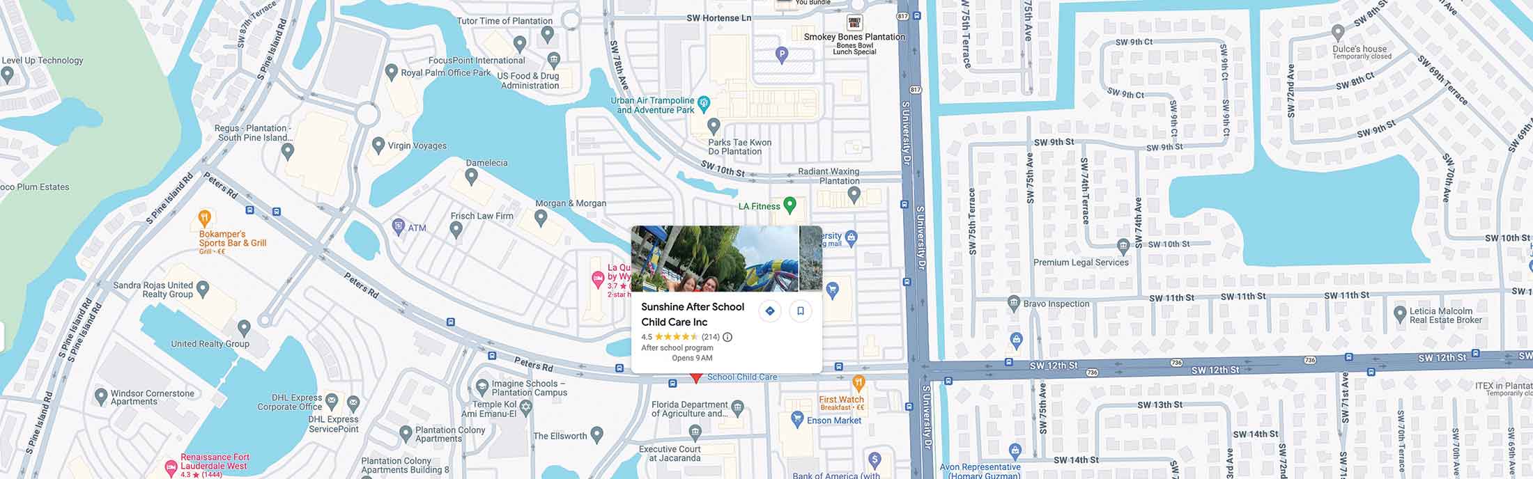 Contact us Contact Us Please get in TouchOur mission is to provide quality English language instruction through a variety. Error: Contact form not found. Email:[email protected] PHONE:Phone: 954-236-8850Fax: 954-236-8881 ADDRESS:Sunshine Child Programs7900 Peters RD - Suite B-101Plantation FL 33324